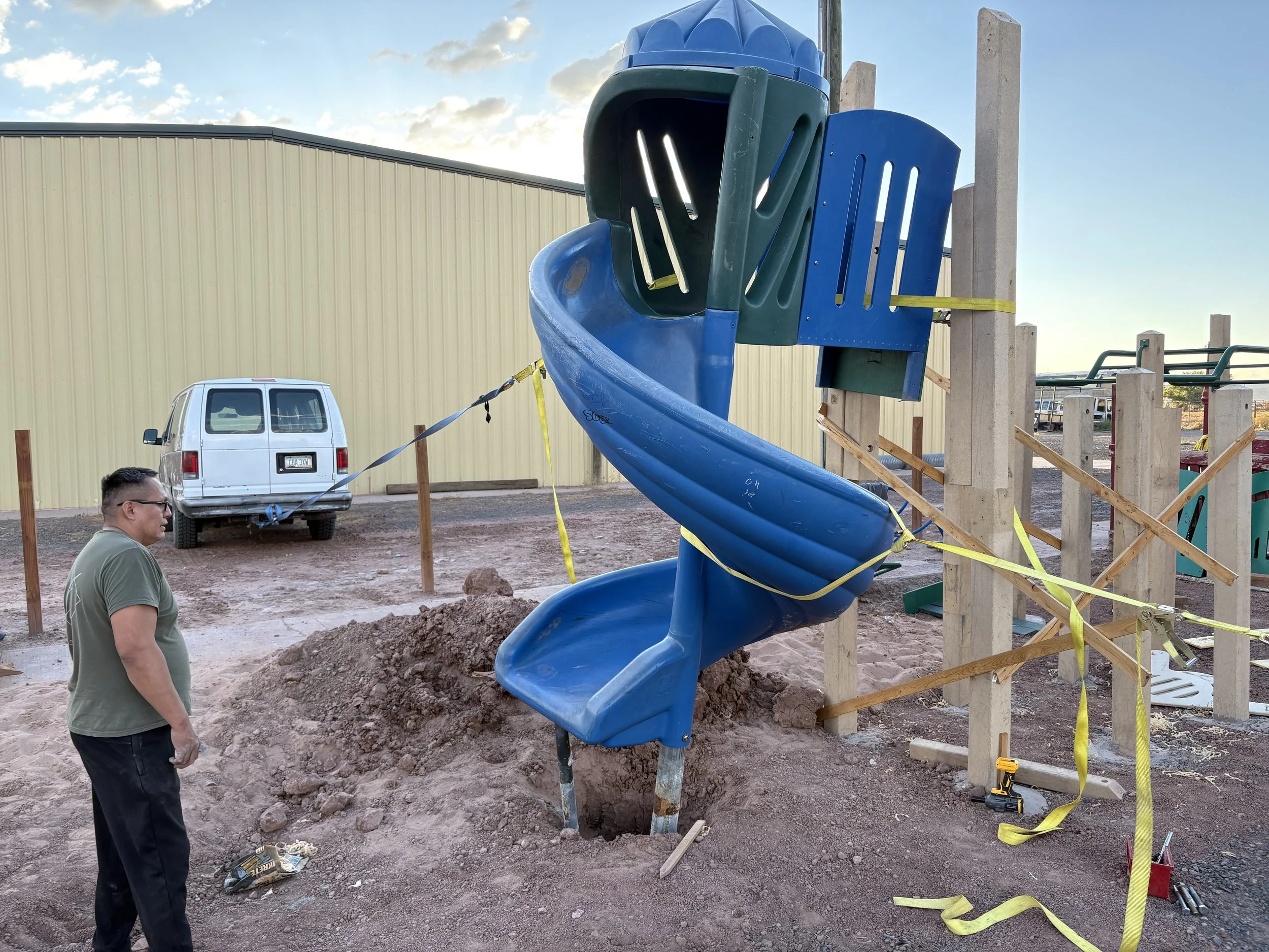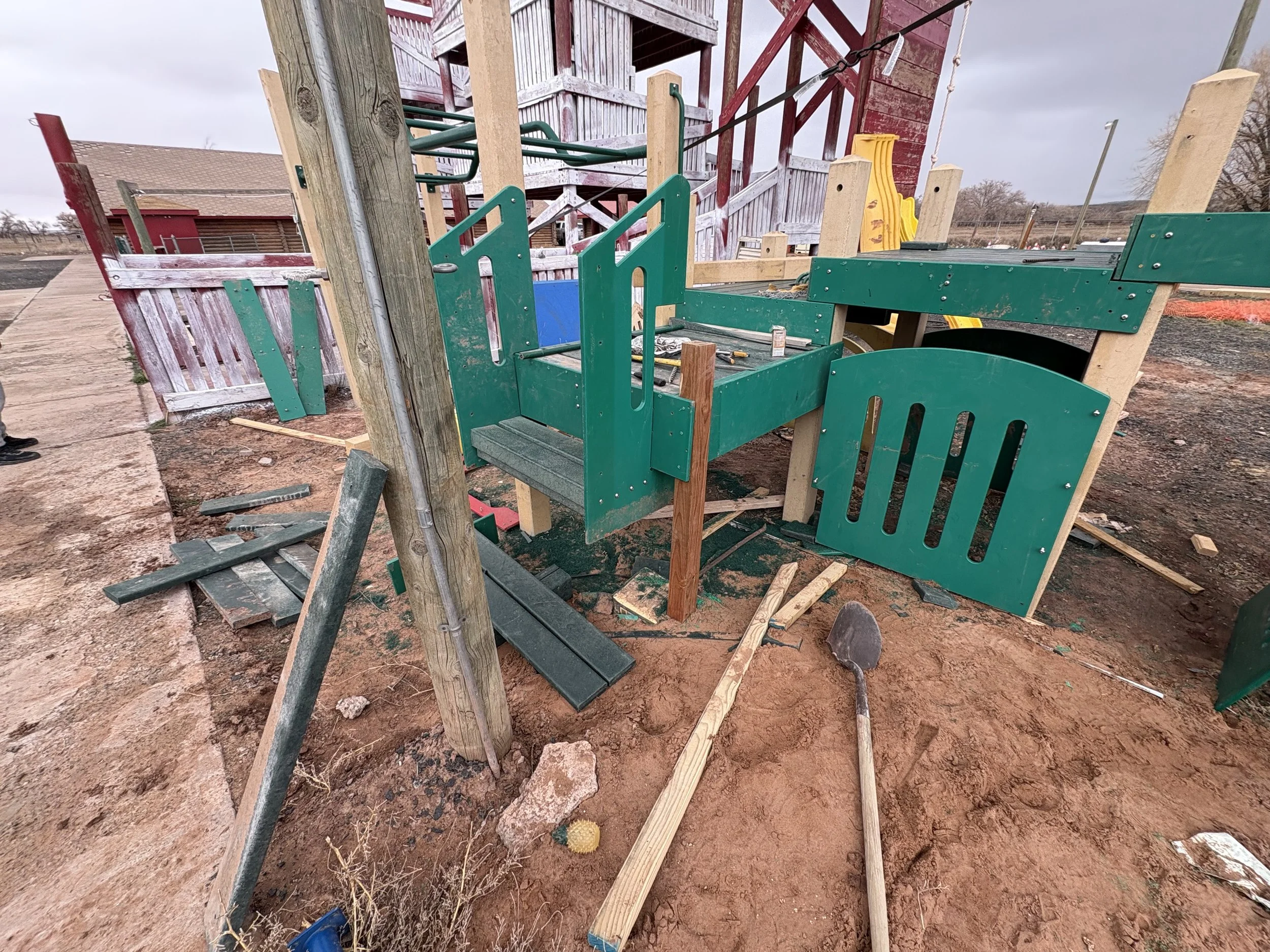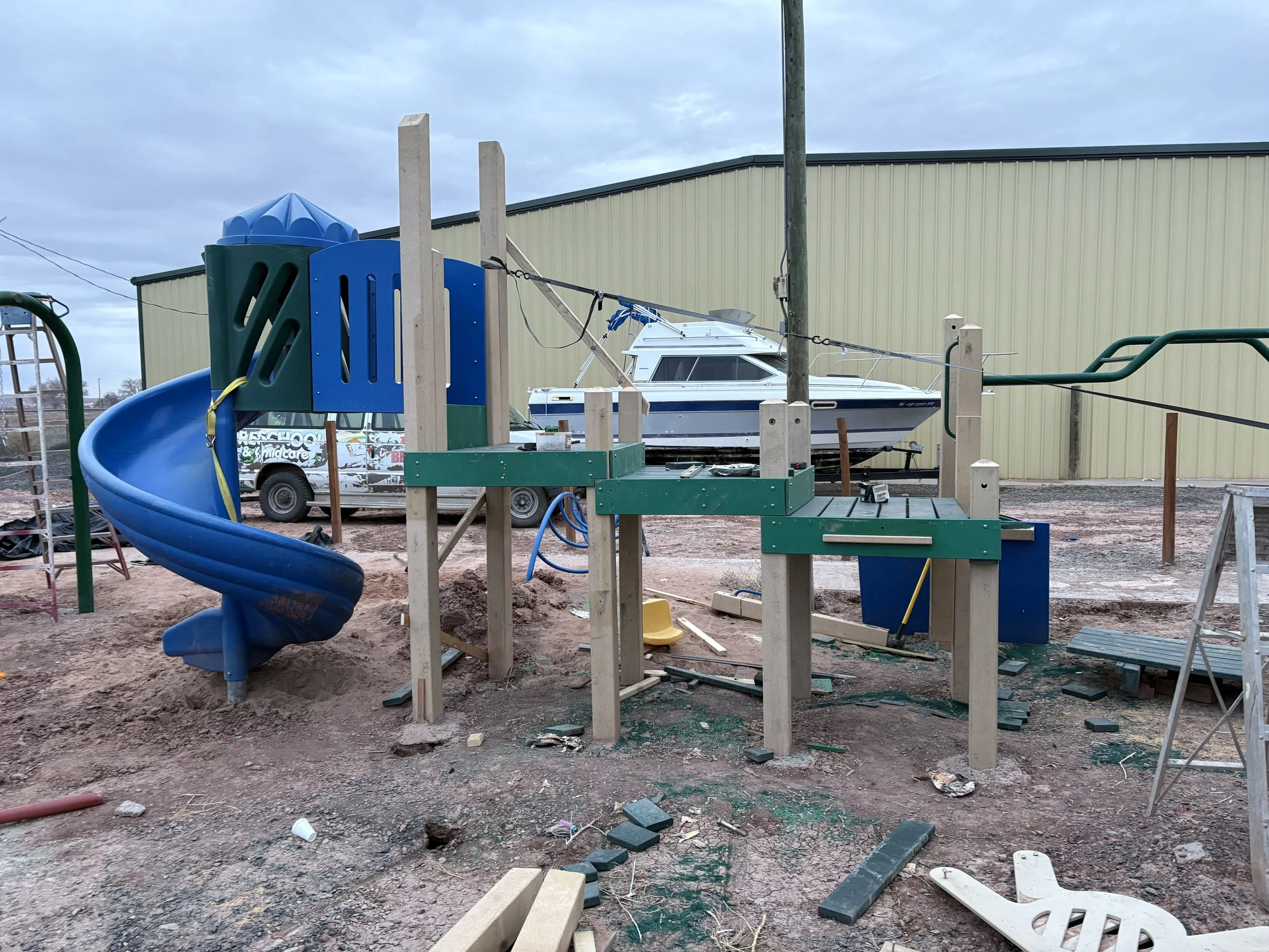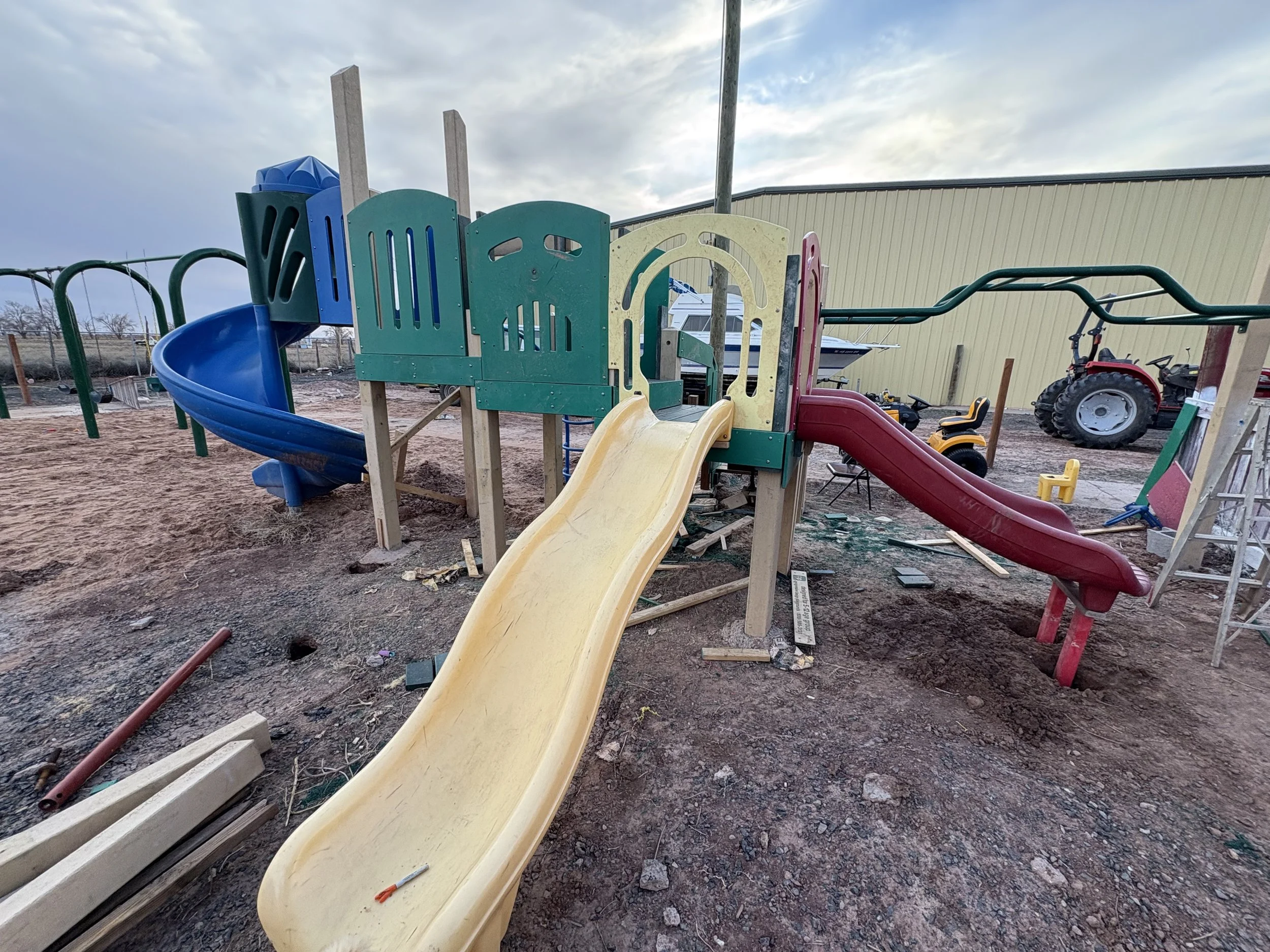It looks like we have to do repairs to the playground towers. Next week we will install fencing to enclose the playground. This week we will be using a skidsteer to dig down a few inches in preparation for the Astroterf. In a few weeks the new playground should be up and we will start placing the Astroterf under it.
