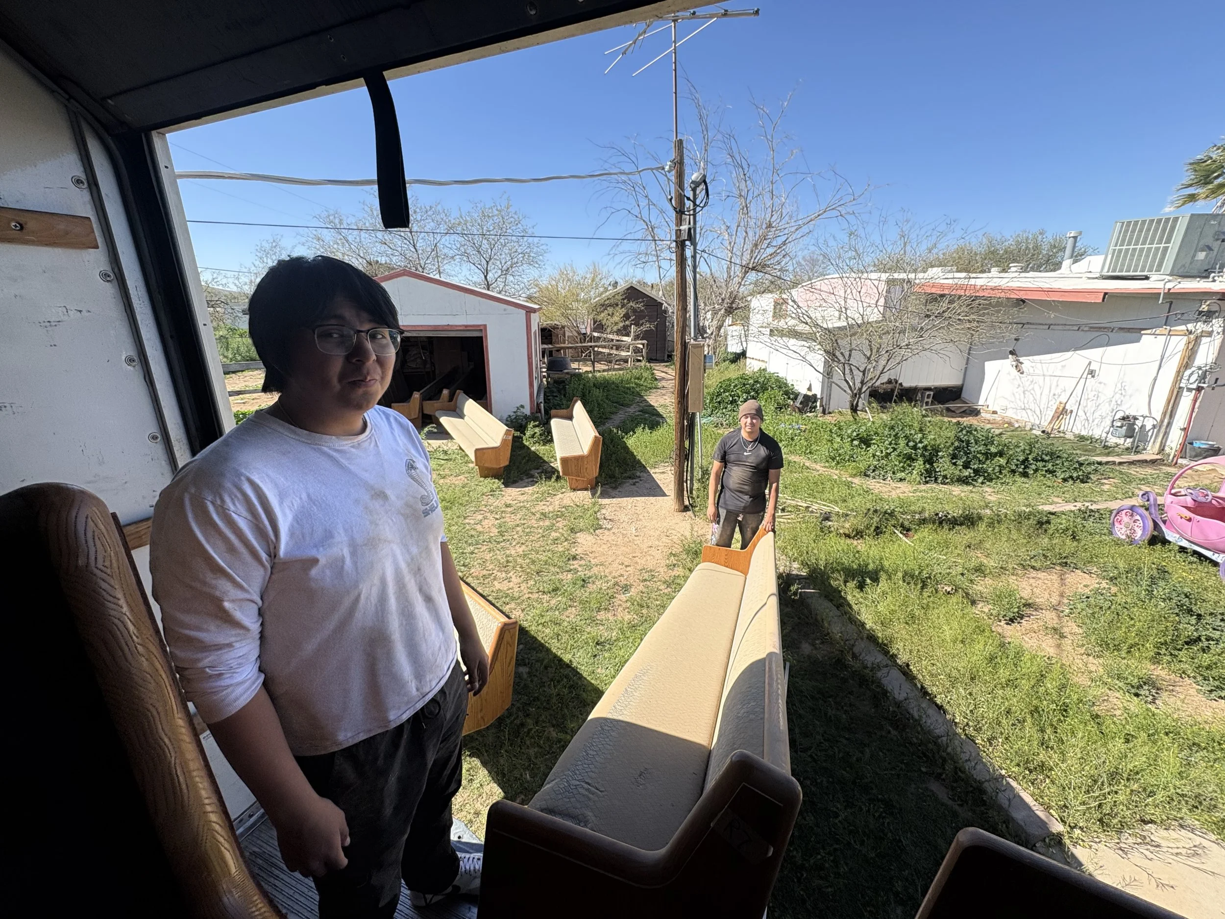 A church in Tucson donated pews. Jeff took Sheamar and Eli to pick them up. It was a difficult job because pews weigh a bunch.