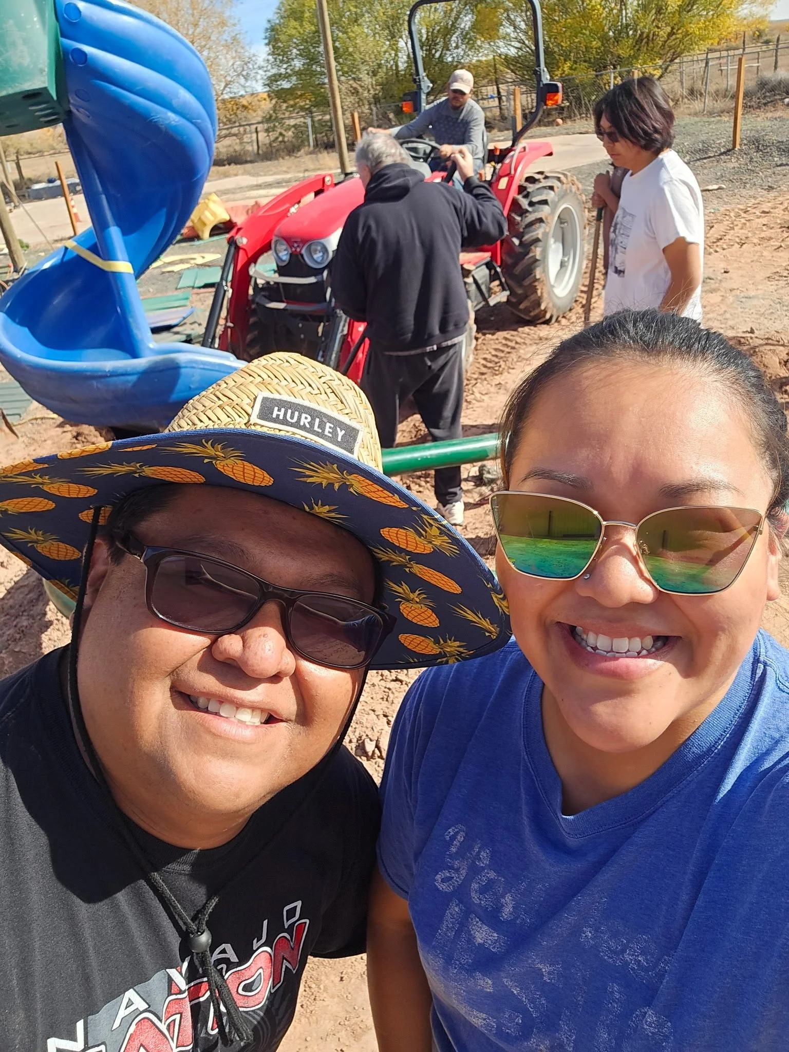 Fred and Gloria Messick (Center) came to see how we were coming along with the playground. On the left is Carol who is part of the Messick’s team and her brother Ernie (Far right).
